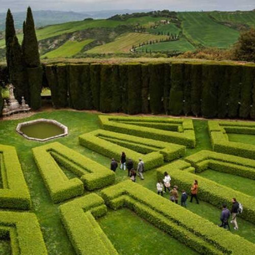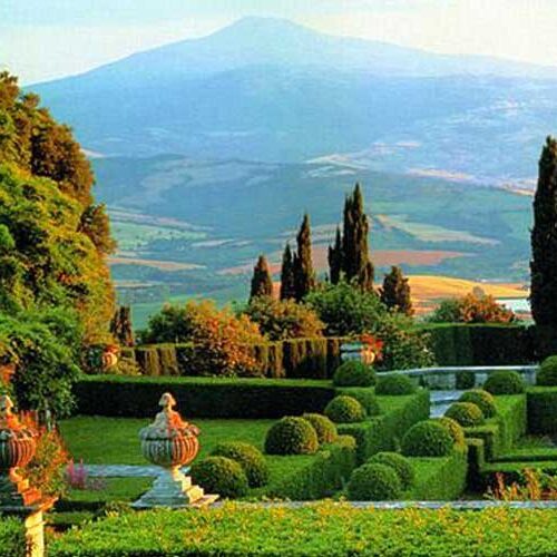 Il primo giardino, il giardino dei limoni, quello delle rose e il giardino inferiore portano ad apprezzare le grandi capacità dell’architetto, che ha saputo sfruttare la morfologia del terreno e incastonare questo luogo prezioso nello splendido scenario della Val d’Orcia. La vista sul Monte Amiata di cui si gode dalla terrazza del Giardino dei Limoni lascia stupefatti dalla meraviglia: l’integrazione perfetta tra paesaggio umano e quello naturale fa restare letteralmente senza parole.