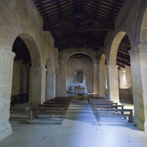 Al suo interno, relativamente spoglio, si trovano tre navate ognuna con un altare. Il campanile è l’elemento più imponente e particolare della struttura: di forma cilindrica, d’origine tipicamente ravennate. Al suo interno si può leggere la lapide che ricorda Padre De Rugeis e vedere la grata del tabernacolo a muro. Qui regna un alone mistico anche grazie alla scarsa illuminazione, se volete meditare e pregare questo è il luogo ideale. Tra i fonti battesimali che ancora rimangono nel territorio senese, quello di Pienza è uno dei più notevoli. In questa chiesa al fonte battesimale furono battezzati sia Papa Pio II che suo nipote Papa Pio III.
